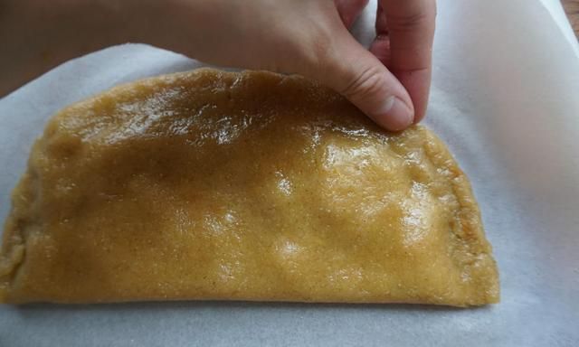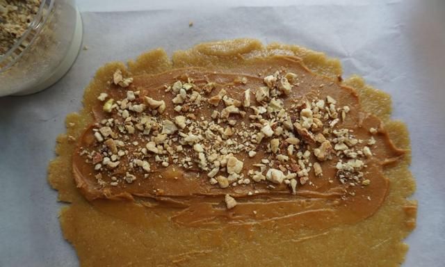 6.另一份如此操作,内馅抹上自制焦糖酱,撒上切碎的果仁,折叠捏好。