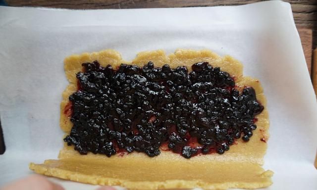 5.在一份的面皮上半部分抹上果酱,然后把没抹过的那边折叠过去盖上,捏紧四周。