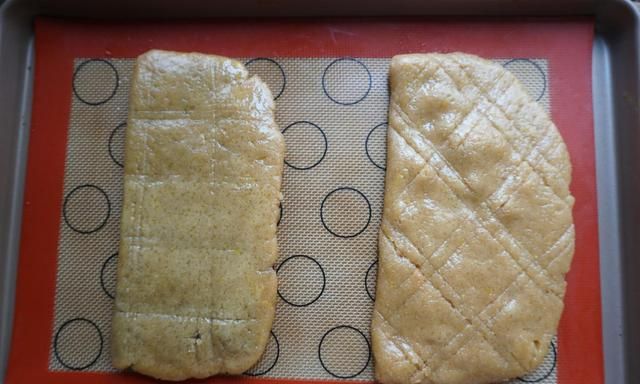 7.2份做好的饼干胚放到烤盘上,表面刷一层蛋液,用刀划出喜欢的花纹