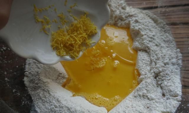 2.然后中间弄个坑,倒入打散的鸡蛋液、酸奶和植物油,放入柠檬皮屑
